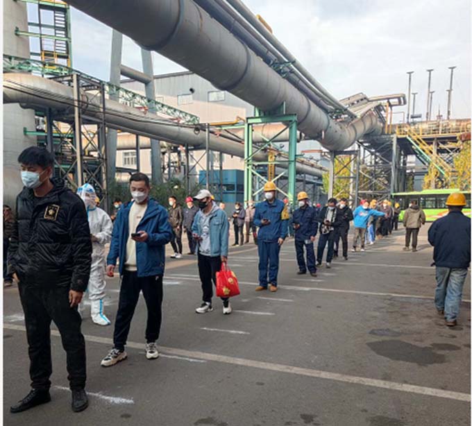 “核酸檢測人員,自覺保持2米距離、戴好口罩”10月12日上午,在公司綜合樓門前,行政處、分廠安全員、核算員積極協調核酸檢測現場秩序,在配合醫護人員開展檢測工作的同時,做好防疫宣傳工作。前來進行核酸檢測的職工在現場排起長龍,積極配合工作人員的指揮。
