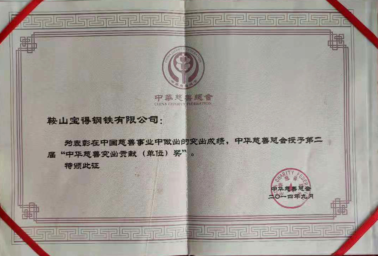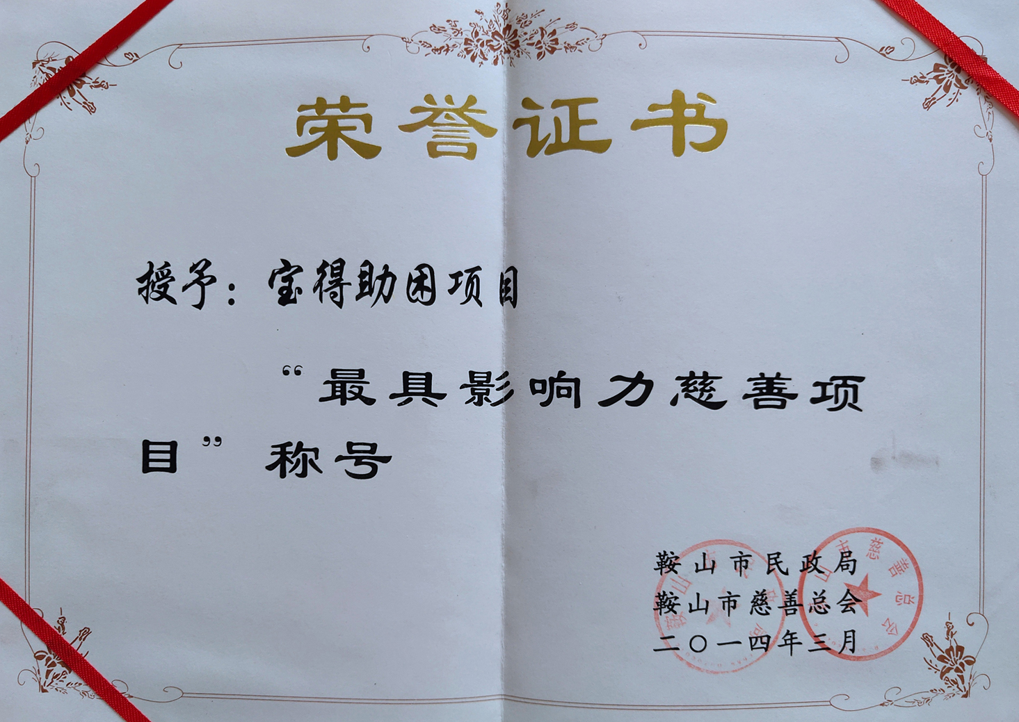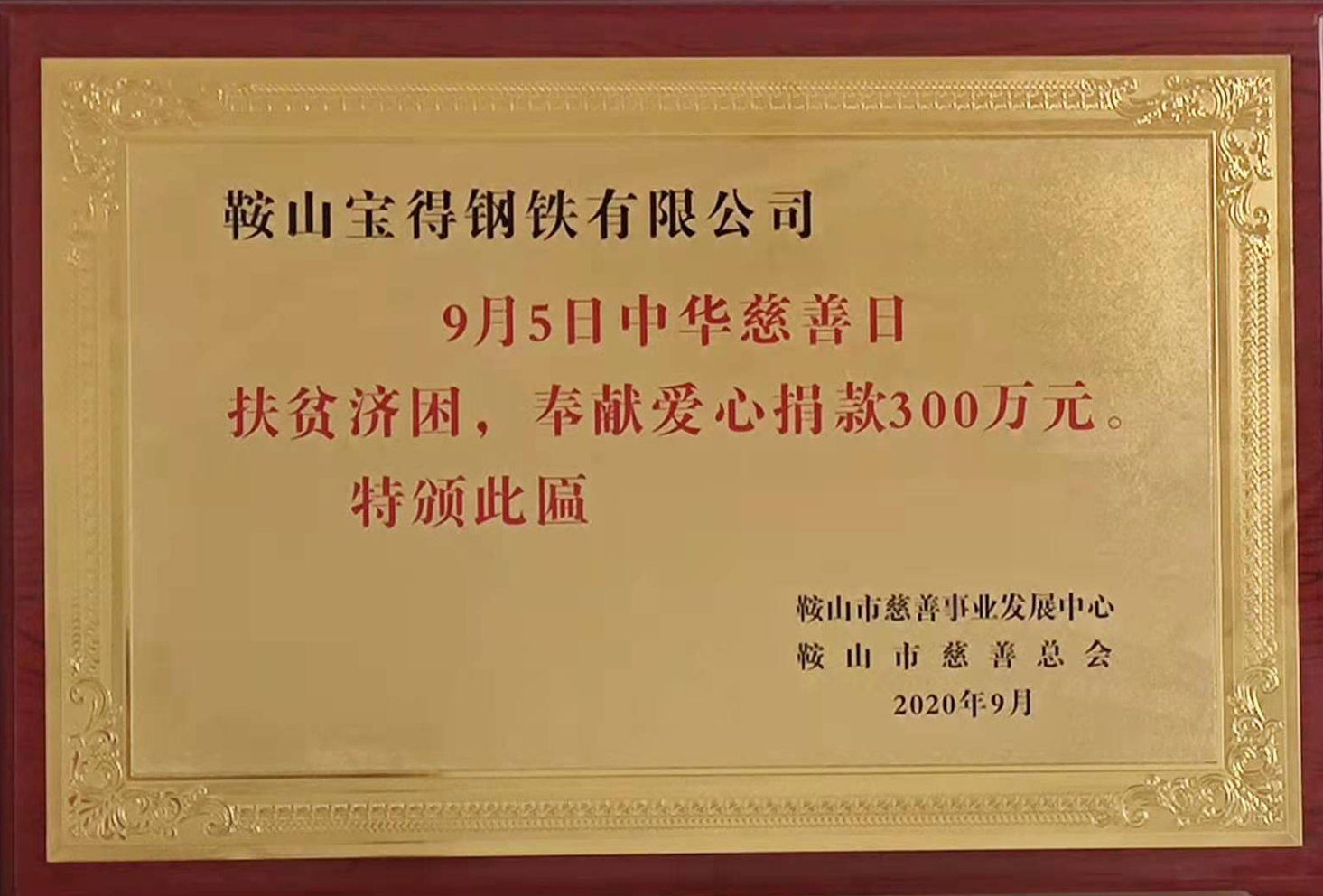 鞍山市慈善總會頒發