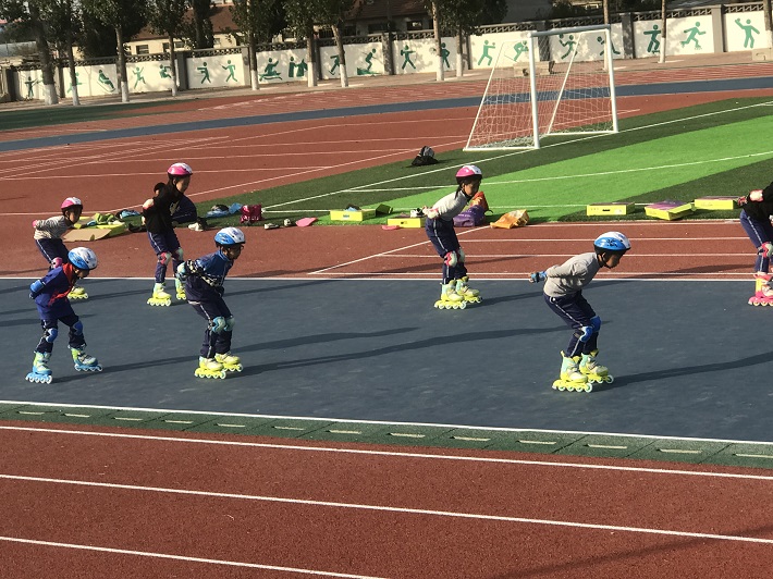 學生在多功能塑膠操場上進行輪滑運動