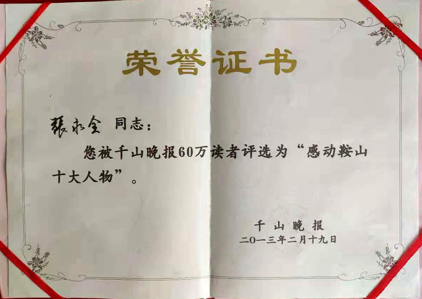 董事長被評為“感動鞍山十大人物”