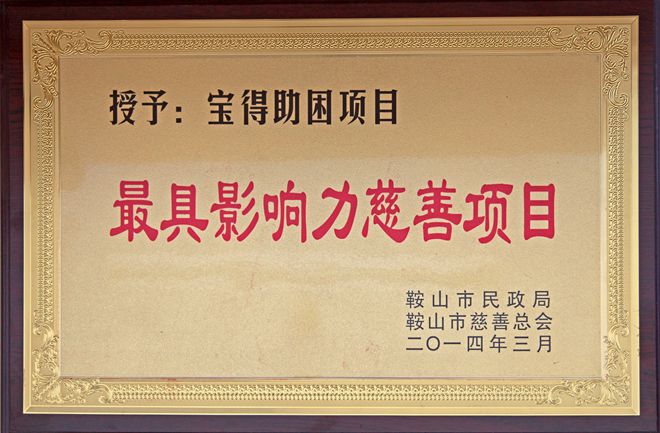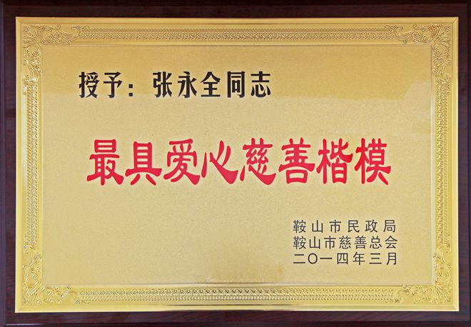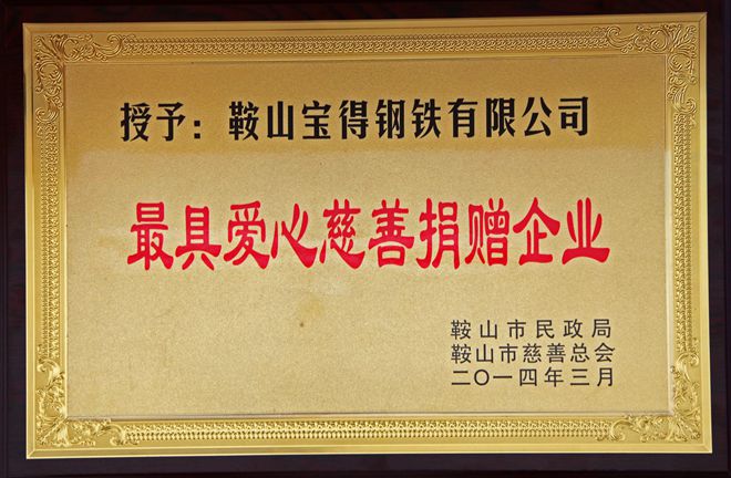 3月7日,在鞍山市慈善總會第三次會員大會上,公司榮獲“最具愛心慈善捐贈企業”、“最具影響力慈善項目”榮譽,董事長榮獲“最具愛愛心慈善楷模”榮譽稱號。