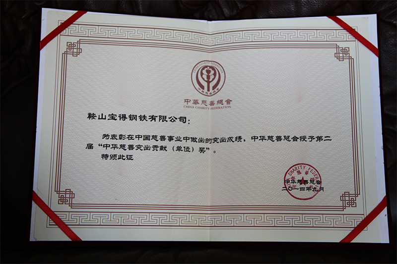 為表彰在中國慈善事業中作出的突出貢獻,中華慈善總會授予公司第二屆“中華慈善突出貢獻(單位)獎”。5月20日,副市長陳守義、市民政局局長解永浮、副局長龔毅濤及市慈善總會領導到公司頒獎,董事長、總經理接受頒獎。