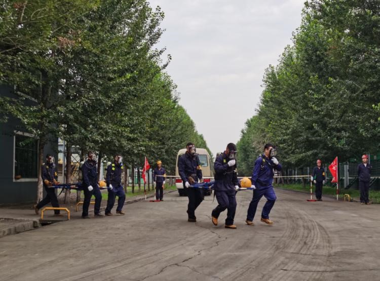“報(bào)告馬廠長(zhǎng):我是當(dāng)班維護(hù)班長(zhǎng)曹雷,9點(diǎn)35分左右班內(nèi)三名員工在煤氣閥組平臺(tái)巡檢過(guò)程中發(fā)生煤氣中毒事故,請(qǐng)求立即支援”……;“請(qǐng)搶險(xiǎn)救援組、安全警戒組、醫(yī)療救護(hù)組…立即趕赴事故現(xiàn)場(chǎng)集結(jié)”;“報(bào)告總指揮:搶險(xiǎn)救援組10人到達(dá)現(xiàn)場(chǎng),6套呼吸器及3副擔(dān)架救援裝備完好,可正常使用”……;“各救援小組按預(yù)案規(guī)定程序及商定的實(shí)施方案,立即展開(kāi)救援行動(dòng)”……;“報(bào)告總指揮:三名傷者已成功救出,兩人中毒較重,一人較輕,……”;“報(bào)告總指揮:煤氣泄漏部位搶修完畢,已無(wú)泄漏現(xiàn)象,設(shè)備可正常運(yùn)行”……。隨著一條條救援指令的下達(dá),現(xiàn)場(chǎng)警戒、現(xiàn)場(chǎng)救援、傷員急救、設(shè)備搶修、現(xiàn)場(chǎng)清理及組織生產(chǎn)恢復(fù)等過(guò)程緊張、有序地完成,實(shí)戰(zhàn)演練圓滿(mǎn)結(jié)束。