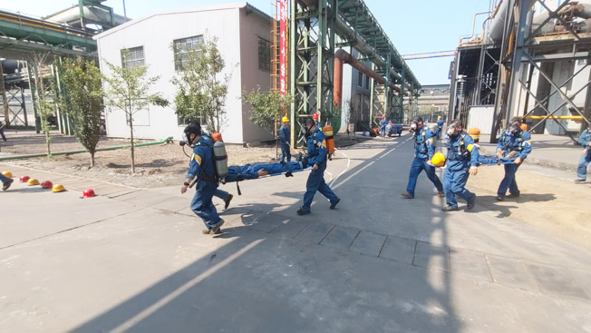 本次演練,煉鐵廠主要領導高度重視、準備充分、計劃周密,并且主要領導和50余名不同崗位、不同工種的一線員工親自參加;使用了空氣呼吸機、蘇生器、擔架、警戒帶、警示燈、對講機、應急救援車輛、應急救援專用袖標、消防救援服、滅火器、消防水帶及撒水車等應急物資和裝備;本次實戰演練展現出指令明確、集結迅速、裝備整齊、信息傳遞暢通、救援行動規范、醫療救護到位、滅火動作嫻熟、后勤保障可靠等諸多特點。